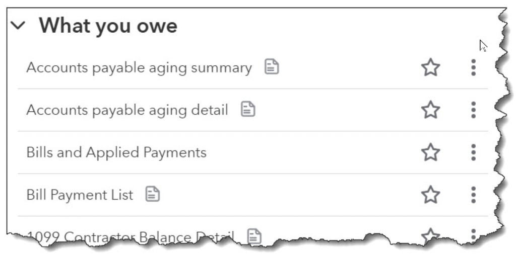 It’s easy to find out what you owe in QuickBooks Online. Remember that the user interface recently changed significantly, and you may not be used to it yet. Click the Reports icon in the toolbar, then Standard Reports. Scroll down to What you owe. There are two reports here that could be most helpful: