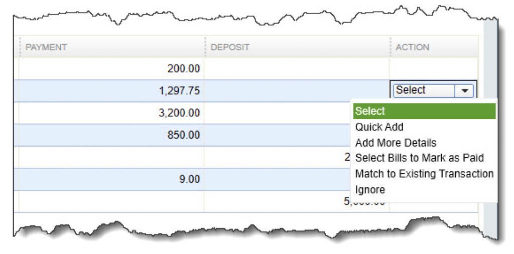 If you’ve connected your bank accounts to QuickBooks, check to see what transactions have come in since the last time you accessed your Bank Feeds. Open the Banking menu and click Bank Feeds | Bank Feed Center. Double-click the account you want to start with and look for a line that says x transactions are waiting to be added to QuickBooks. If there are any, click Transaction List. Click the down arrow in the Action column to handle the transaction.
