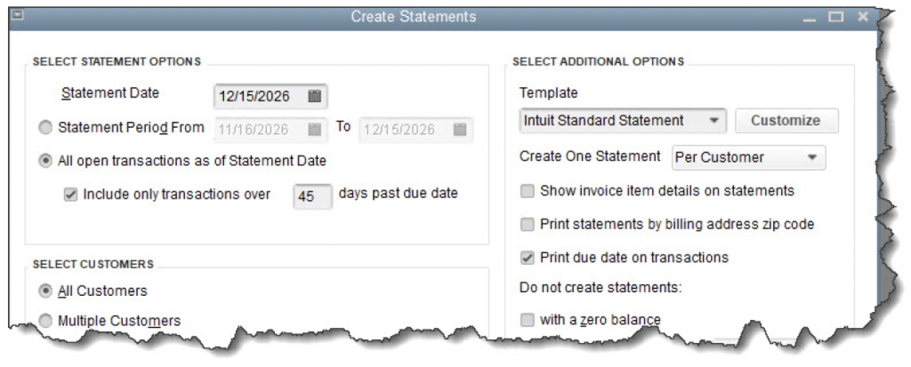 - Send Statements. Open the Customers menu and click Create Statements. You’ll see a window like the one pictured above. Statements are basically lists of sales transactions that show customers what their outstanding debts and credited payments are over a period of time.