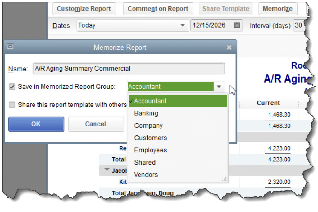 Memorized Reports. Once you’ve customized a report, you may want to save the template so you can run it again with new data in the future. Open the report whose framework you want to save, like A/R Aging Summary (who owes you money? Are any of them past due, and by how much?). Do your customizing (Customize Report,). When you’re satisfied with your changes, click Memorize in the toolbar. In the window that opens, give your report a Name and choose the appropriate Memorized Report Group if you want to store it in one. If not, just click OK. To find your reports, go to Reports |Memorized Reports.